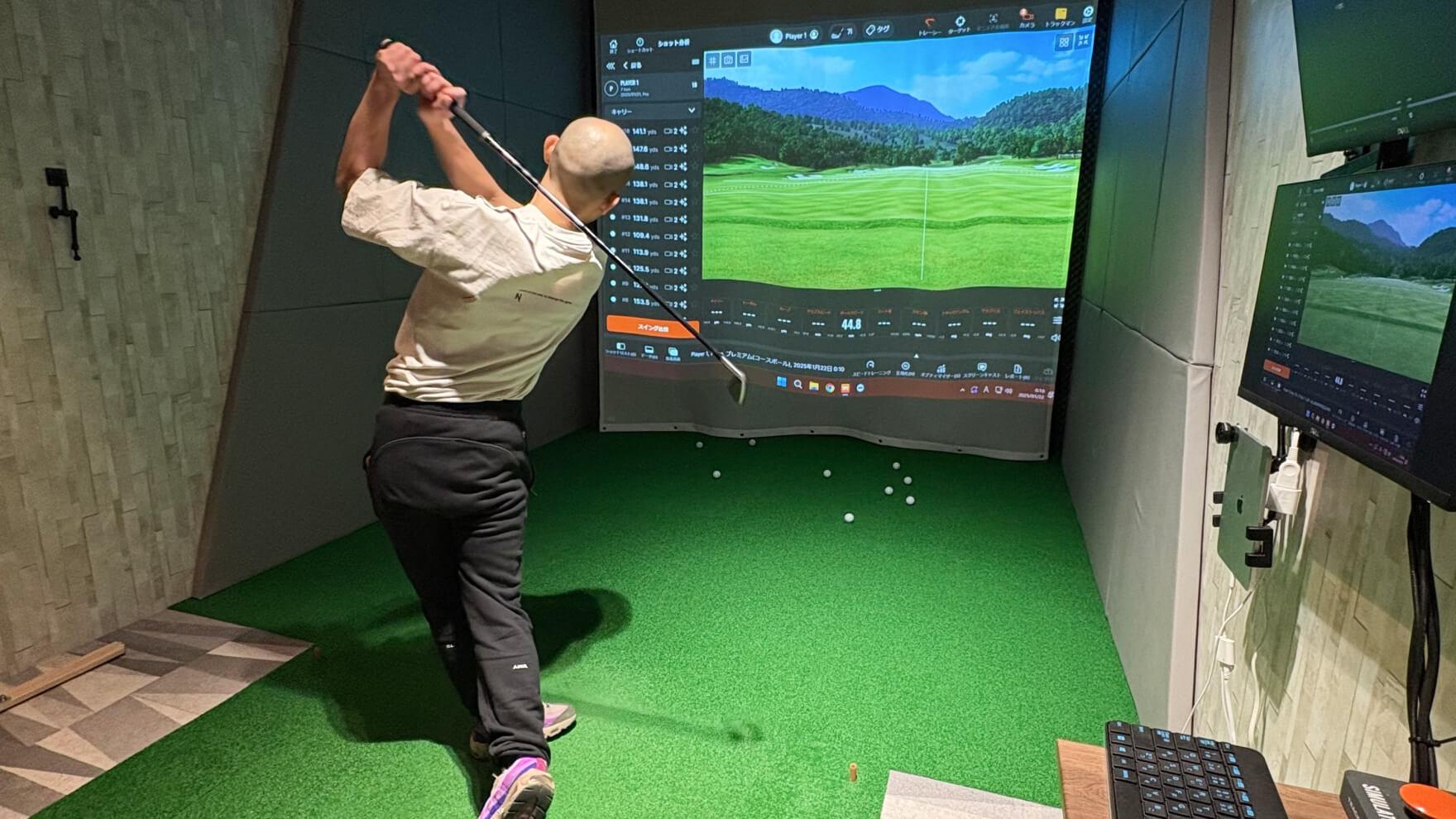 従来のネットや的に向かって打つだけの練習ではなく、最大200インチの大画面プロジェクターに映し出されるリアルなコース映像の中で、まるで本物のラウンドをしているかのような臨場感を味わいながら練習できます。ショットの結果は即座に映像に反映され、スイングの改善点をリアルタイムで確認しながら調整が可能。ゴルフ場さながらの環境で、競技志向のプレイヤーにとって理想的なトレーニングが実現します。